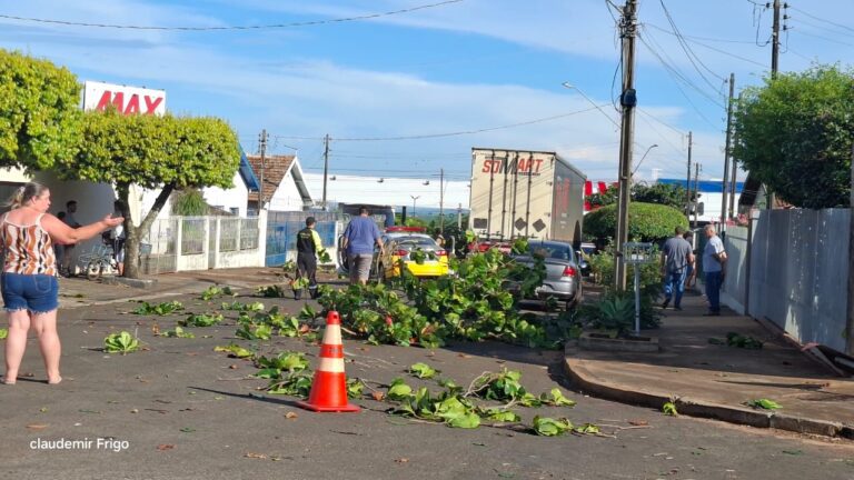 Motorista bateu em carro parado e derrubou galhos sobre duas mulheres, deixando uma delas ferida; veículo que passava parou na frente da carreta para evitar