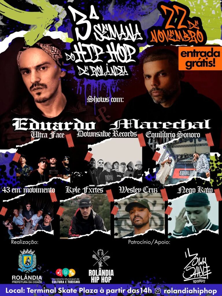 NO sábado (22), o Terminal Skate Plaza, na Vila Oliveira, recebe a 3ª Semana do Hip Hop de Rolândia a partir das 14 horas, com entrada GRATUITA. Já estão confirmados os shows de atrações como Eduardo Taddeo, Marechal, Ultra Face, Kyle Fxrtes, Equilíbrio Sonoro, Downsalve Records, 43 em Movimento, Wesley Cruz e Nego Kaw.