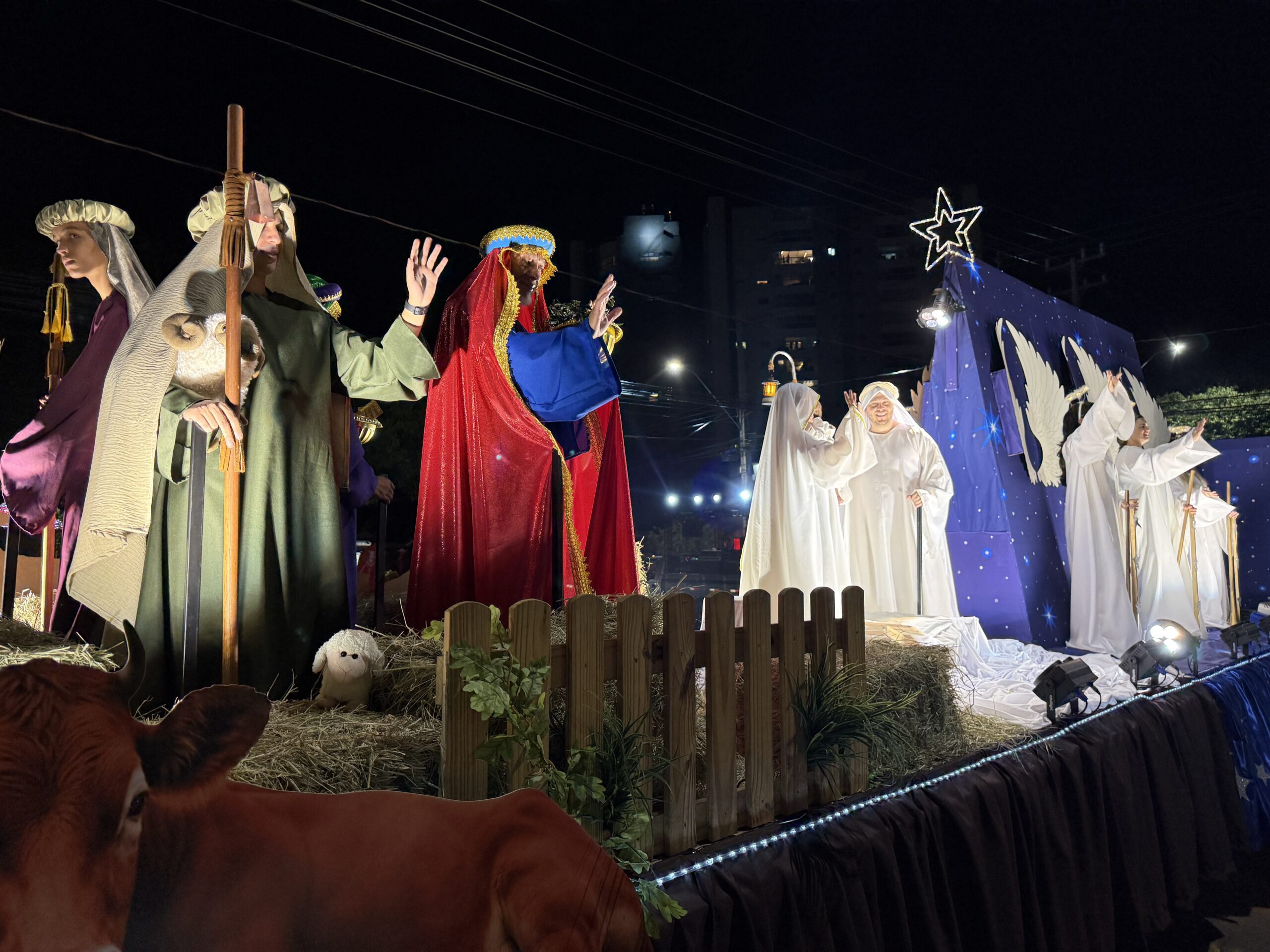 Nesta segunda-feira (22), o encerramento da Natal Fest é marcado pela Carreata da Sagrada Família, com personagens vivos representando José, Maria e o Menino Jesus, acompanhados por anjos, pastores e magos. A saída está prevista para as 19h, em frente à Igreja Matriz São José. A carreata percorre as principais vias centrais da cidade, incluindo Expedicionários, Castro Alves, Interventor Manoel Ribas, Tiradentes, Presidente Bernardes, Santos Dumont e Willie Davids, retornando ao ponto inicial após cerca de uma hora e meia.