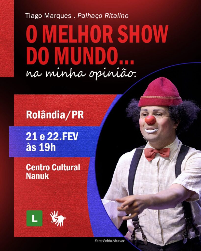 A Secretaria de Cultura e Turismo de Rolândia informa que o Palhaço Ritalino se apresenta neste sábado e domingo, sempre às 19h, no Centro Cultural Nanuk, com um espetáculo de comédia voltado para toda a família.