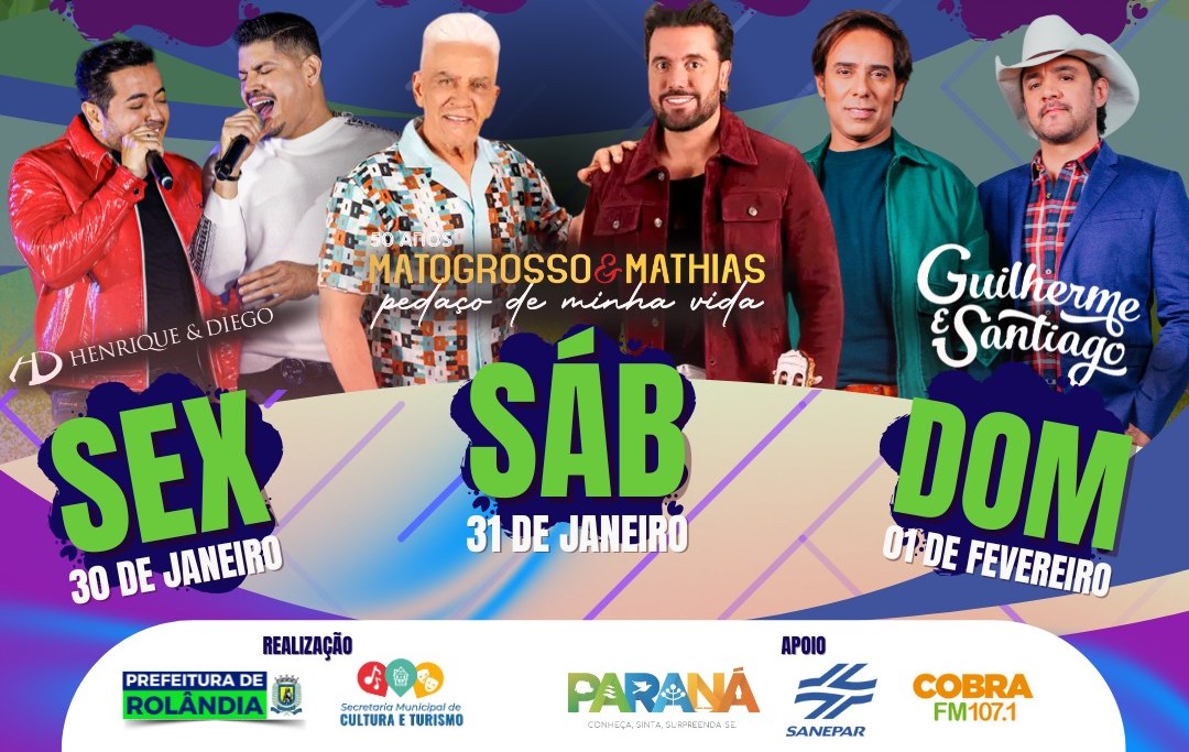 Promovida pela prefeitura de Rolândia, através da secretaria municipal de Cultura e Turismo, a festa de aniversário de 82 anos de emancipação política de Rolândia começa nesta sexta-feira (30) – o aniversário foi no dia 28. Serão três dias de eventos, de sexta a domingo (1º de fevereiro), no estádio municipal Erich Georg.