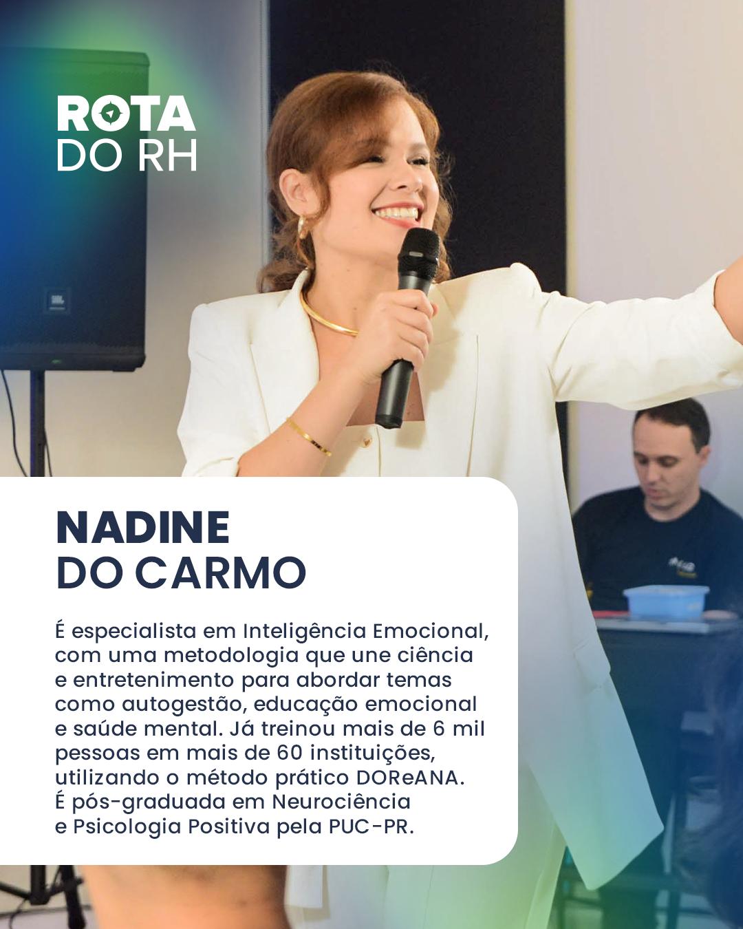 Já Nadine do Carmo, com uma metodologia que une entretenimento e ciência, abordará temas como Educação Emocional, Autogestão, Comunicação Não-Violenta e Saúde Mental, aplicando o método DOReANA que treina, na prática, a Inteligência Emocional.