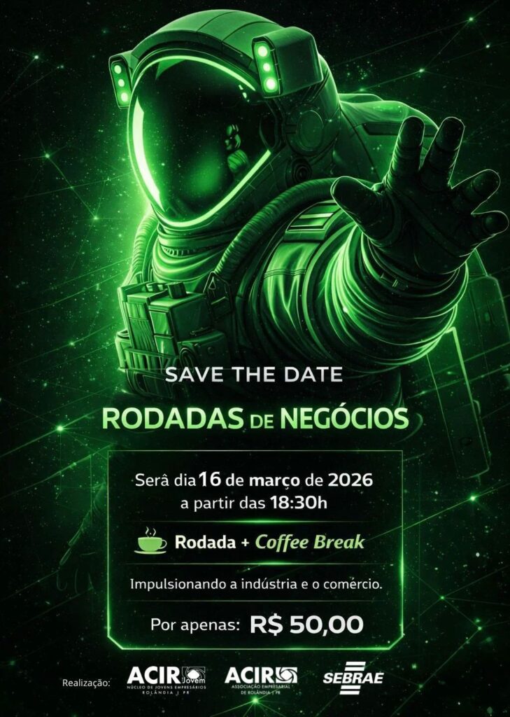 A ACIR Jovem de Rolândia realiza, no dia 16 de março, às 18h30, uma Rodada de Negócios em parceria com o Sebrae, cujo objetivo é fortalecer o ecossistema empresarial regional e fomentar novas oportunidades entre empresários, indústrias e prestadores de serviço. O encontro está marcado inicialmente para o auditório da ACIR. Para participar investimento é de apenas R$50, com pagamento via PIX (78.024.932/0001-61). As inscrições já estão disponíveis e podem ser feitas por meio do link https://abre.ai/oQnM (encurtado pelo JR).