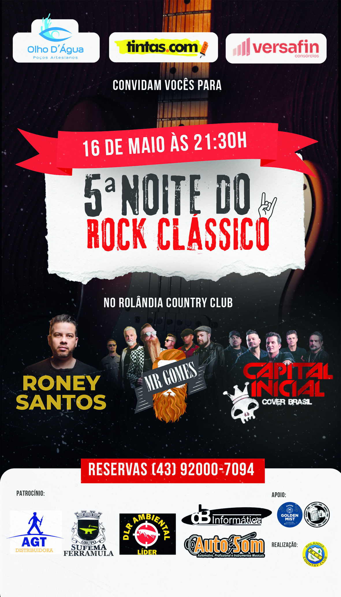 Agende aí: no 16 de maio acontece a 5ª edição da Noite do Rock Clássico no Rolândia Country Club. O evento reúne diferentes vertentes do gênero voltados aos fãs de várias gerações.