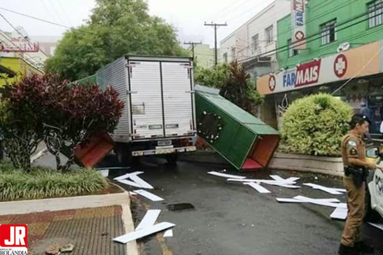 O Portal de Natal, colocado na entrada do Calçadão de Rolândia, foi derrubado por um caminhão-furgão de uma transportadora na manhã deste sábado (10). O