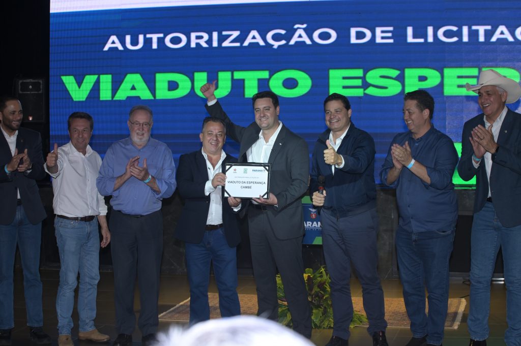 O Viaduto da Esperança, de Cambé, avançou mais uma etapa e está cada vez mais perto de sair do papel. Em um evento na manhã da quarta-feira (15), o governador Ratinho Junior entregou ao prefeito Conrado Scheller a autorização para o lançamento do edital de licitação para início das obras. O documento foi entregue em cerimônia em Cambé, no Projeta Norte da Associação dos Municípios do Médio Paranapanema (Amepar) – presidida pelo prefeito Conrado. A estrutura será construída na BR-369, no quilômetro 161, no cruzamento com a Avenida da Esperança, com custo estimado de R$ 25 milhões.
