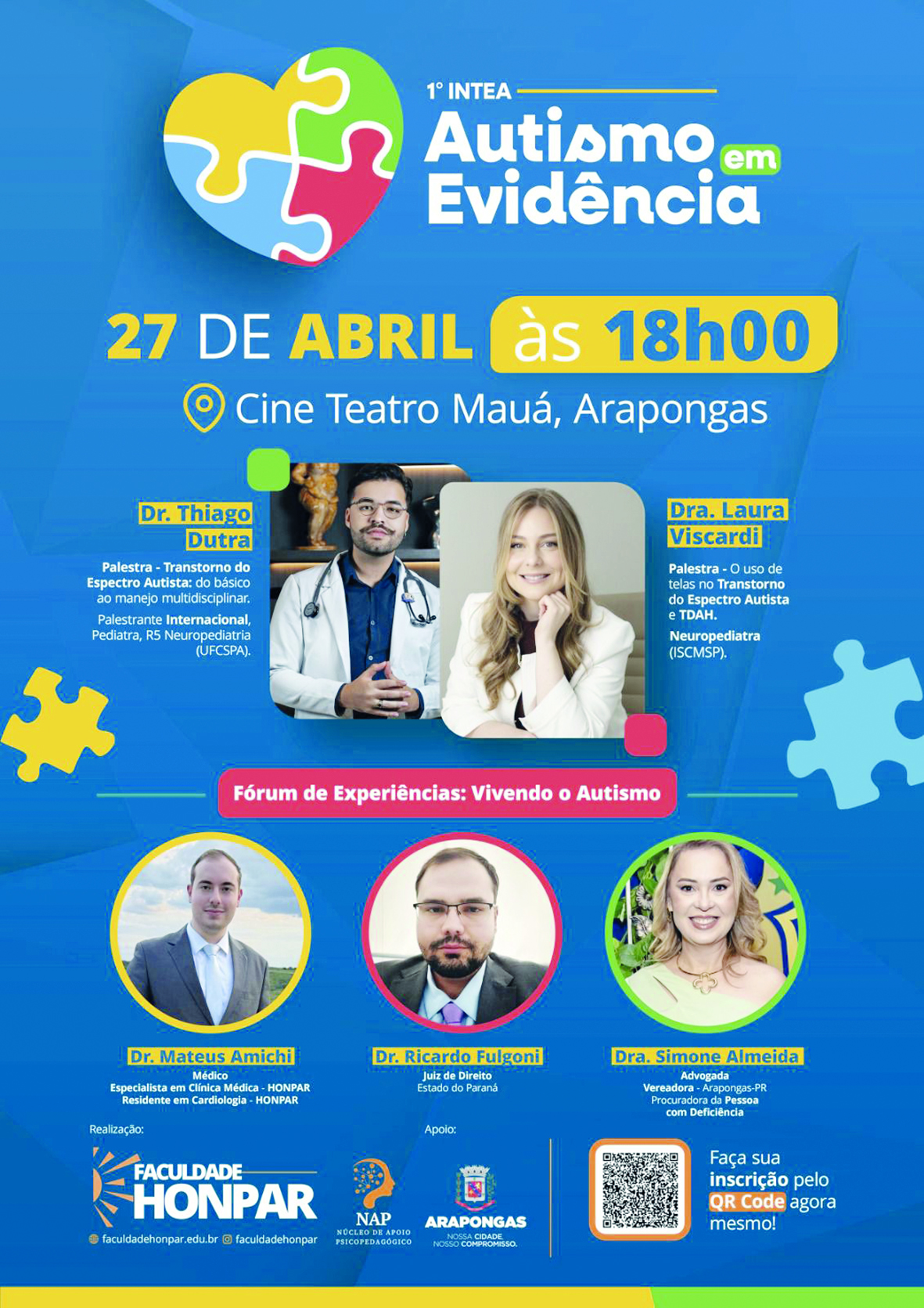 Arapongas sedia, no dia 27 de abril, o 1º INTEA Autismo em Evidência – Conferência Integrada sobre o Transtorno do Espectro Autista, promovido pela Faculdade HONPAR e Prefeitura do Município. O evento é gratuito e acontece no Cine Mauá (Rua Uirapuru, nº 55, Centro).