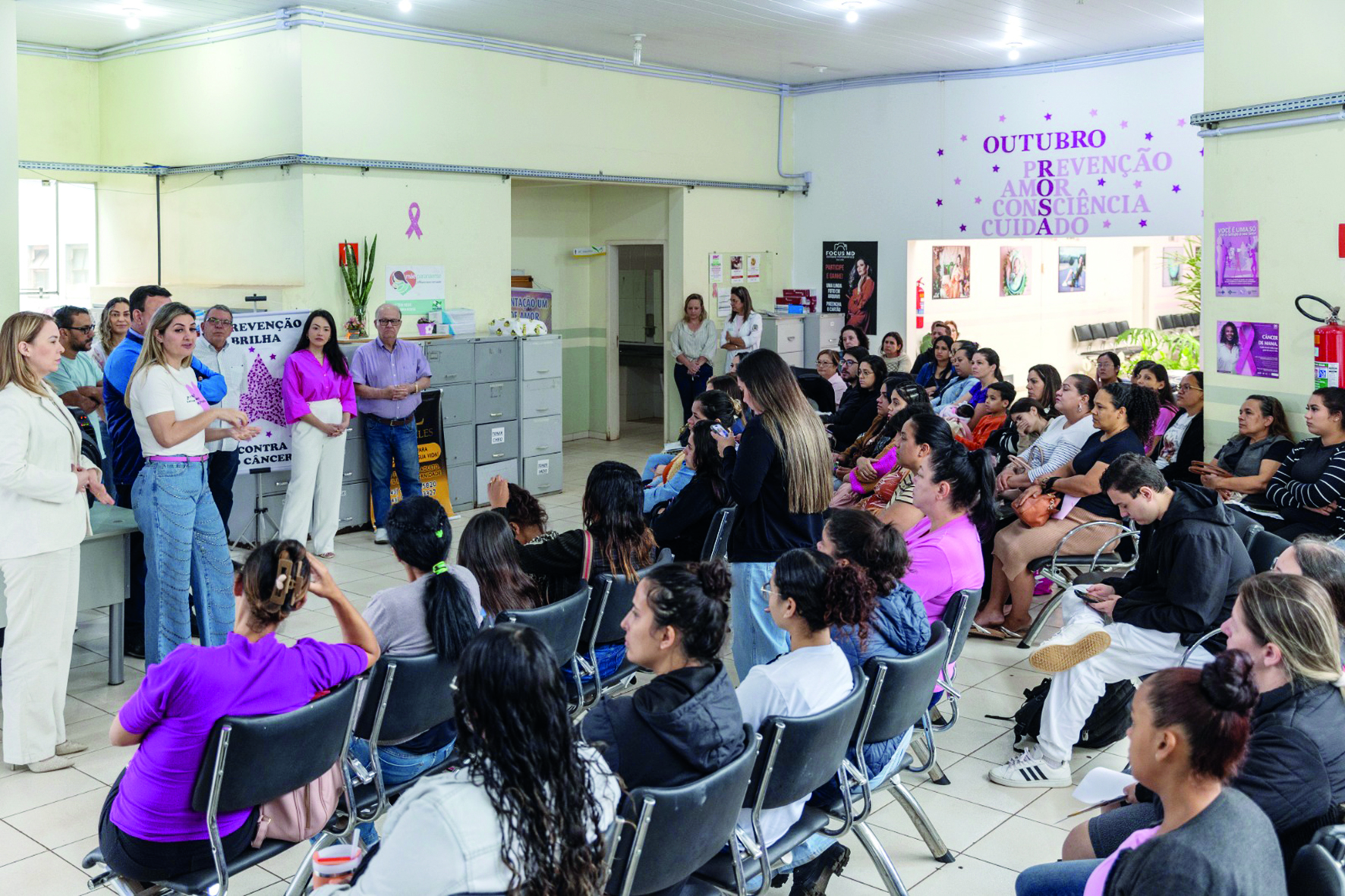 A gerente do Cisam, Juliana Parazzi, recepcionou os participantes e agradeceu a presença de todos. “Quero dizer para vocês que, neste mês, nós teremos várias atividades, e a principal é o agendamento da mamografia, que é um exame super importante”, comenta. “De janeiro a janeiro, ofertamos esse exame. Mas, no mês de outubro, como é o mês de conscientização sobre o câncer de mama, nós promovemos ações mais intensificadas, também incluindo a coleta de preventivo”, reforça.